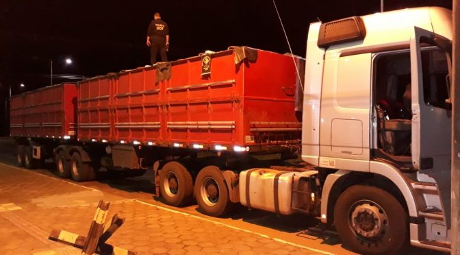 Juti (MS) – Policiais do Departamento de Operações de Fronteira (DOF) apreenderam na noite de domingo (10), por volta das 21h, um caminhão trator acoplado a dois semirreboques carregados com 47.500 pacotes de cigarros de diversas marcas contrabandeadas do Paraguai.