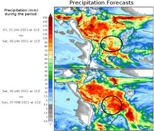 Até dia 30 de janeiro as condições serão favoráveis à ocorrência de pancadas de chuvas em todas as áreas associado aos ventos úmidos que vêm da região norte do país e as elevadas temperaturas. O maior volume de chuva deve ocorrer na região sul com acumulados de até 125 mm, e entre 50 a 80 nas demais áreas.