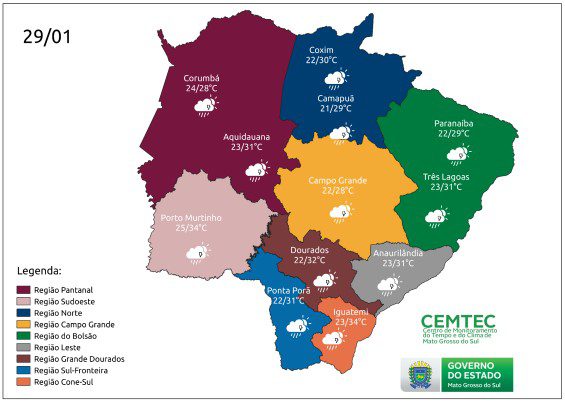 Campo Grande tem previsão de temperatura de 22°C (mínima) a 28°C (máxima),. Já Dourados varia de 22°C e 32°C. Na região do Pantanal, em Corumbá, a máxima será de 28°C e mínima de 22°C. As três citadas têm possibilidade de chuva ao longo do dia.