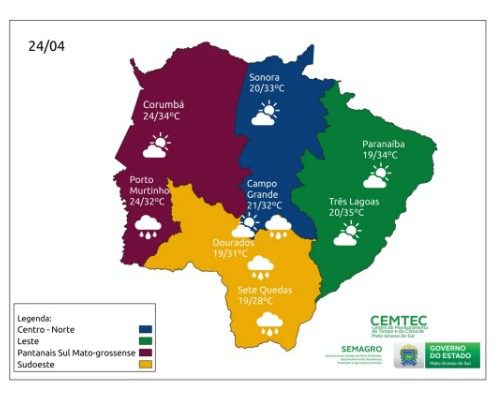 No Sudoeste, o município de Dourados pode registrar temperaturas mínimas entre 18 e 20ºC e máximas de até 31ºC. Na região Sul-Pantaneira, em Porto Murtinho, as mínimas ficarão entre 23 e 24ºC e máximas de até 32ºC. Para Campo Grande, espera-se mínimas entre 21 e 23ºC e máximas de até 32ºC.