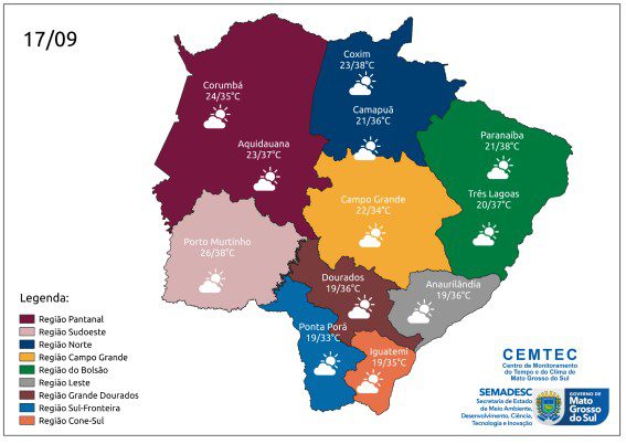 Em Corumbá, na região pantaneira, a mínima será de 24°C e máxima de 35°C; Aquidauana terá variação entre 23°C e 37°C. No sudoeste, Porto Murtinho amanhece com 26°C e atinge os 38°C. No norte, Coxim terá 23°C cedo e alcançará os 38°C ao longo do dia. No Bolsão, Três Lagoas registra 20°C pela manhã e 37°C de tarde.