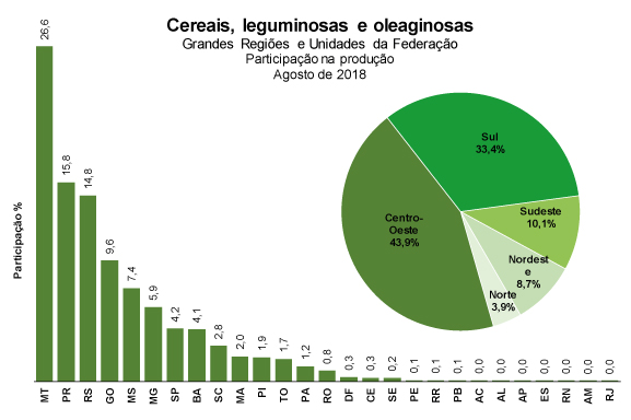 A oitava estimativa de 2018 para a safra nacional de cereais, leguminosas e oleaginosas totalizou 225,8 milhões de toneladas, 6,2% inferior à obtida em 2017 (240,6 milhões de toneladas), com redução de 14,8 milhões de toneladas. A área a ser colhida foi estimada em 61,0 milhões de hectares, com queda de 159,8 mil hectares.