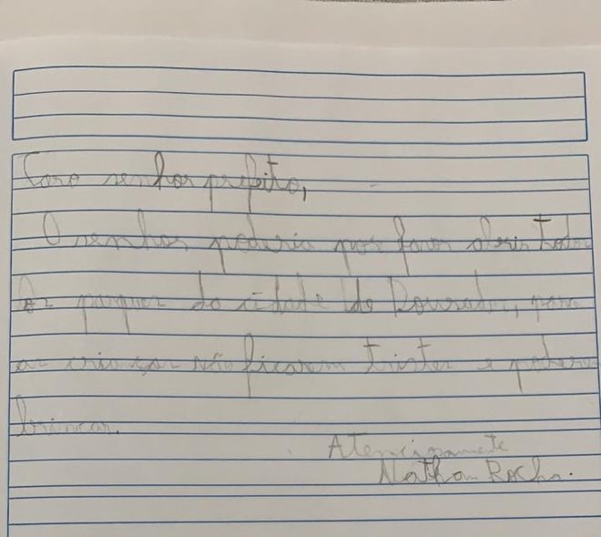 ” Com a pandemia e o lockdown fecharam todos os parques e foi aí que pensei em mandar a carta para o prefeito pedindo para ele abrir para que eu e as crianças possamos voltar a brincar. Sinto falta disso”, afirma.
