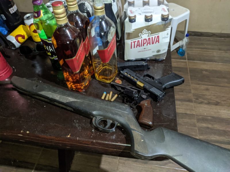 No local cerca de 18 jovens foram flagrados, aglomerados, ingerindo bebidas alcoólicas, não usando máscara de segurança, fumando narguile e perturbando os vizinhos. No local a polícia também apreendeu arma de fogo, um revólver calibre 38 carregado com 03 munições, um simulacro de pistola, uma espingarda de pressão, máquina de fumaça e iluminação de DJ.