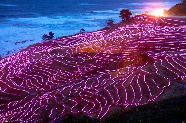 Os terraços de arroz Shiroyone Senmaida, localizados à beira do mar do Japão, na província de Ishikawa, contam com mais de mil produtores, somando 3,4 hectares. Todos os anos, voluntários da cidade de Wajima enfeitam as lavouras com lâmpadas de LED — este ano foram 25 mil.