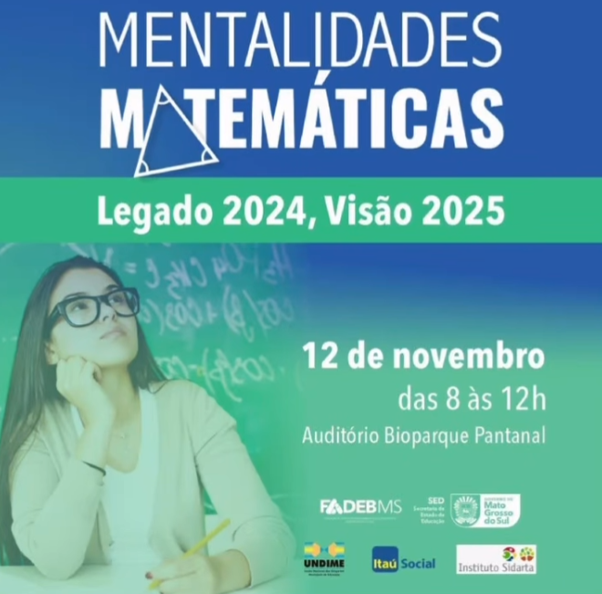 O projeto “Mentalidades Matemáticas” realiza o evento Legado 2024, Visão 2025 no próximo dia 12 de novembro, no Auditório do Bioparque Pantanal, em Mato Grosso do Sul. O encontro, que inicia às 08h00 e vai até as 12h00, reunirá educadores, secretários municipais de educação e gestores para discutir as ações e resultados do projeto ao longo deste ano, além de lançar o processo de seleção para novos parceiros em 2025.