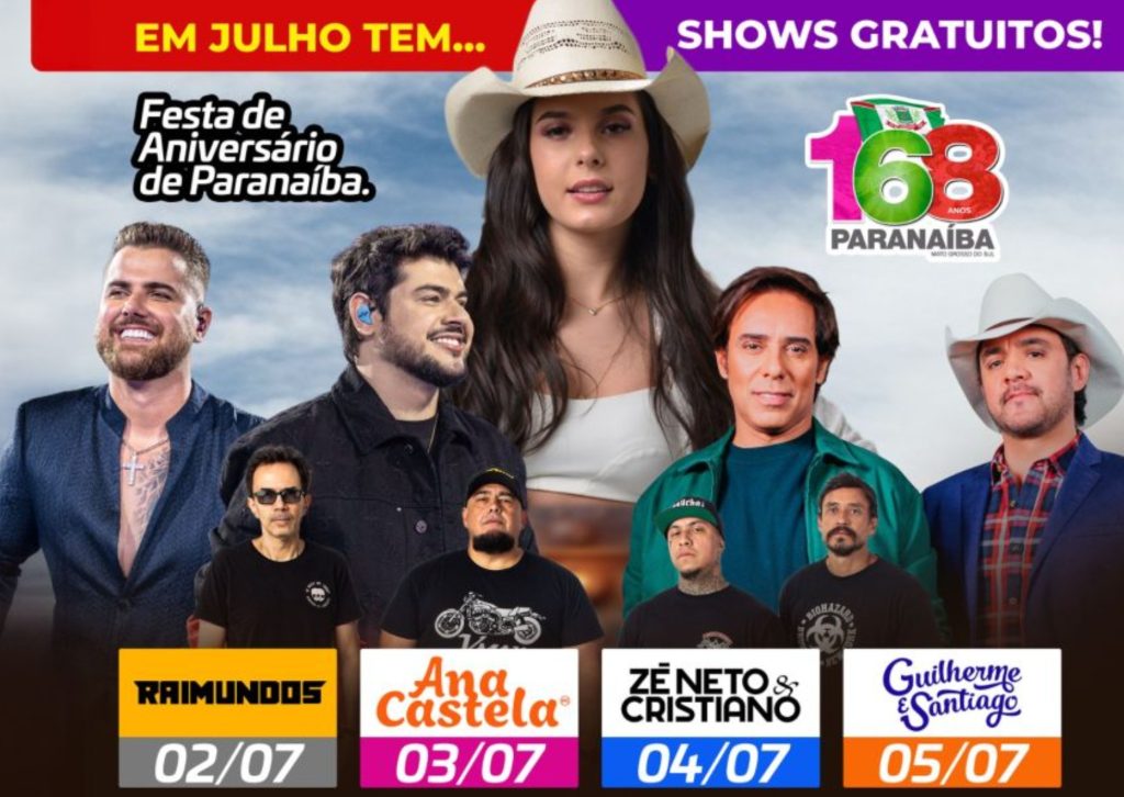 A comemoração do 168º aniversário de Paranaíba contará com uma programação diversificada entre os dias 2 e 5 de julho, unindo shows de artistas de renome nacional, rodeio profissional e o tradicional desfile cívico. Para garantir parte das atrações do evento, que terá entrada franca, a Prefeitura Municipal está investindo R$ 1,63 milhão na contratação de dois dos quatro principais shows.