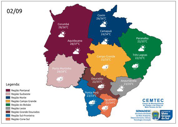 Em Corumbá, na região pantaneira, a mínima será de 28°C e máxima de 36°C; Aquidauana terá variação entre 28°C e 37°C. No sudoeste, Porto Murtinho amanhece com 29°C e atinge os 39°C. No norte, Coxim terá 26°C cedo e alcançará os 36°C ao longo do dia. No Bolsão, Três Lagoas registra 22°C pela manhã e 35°C de tarde.