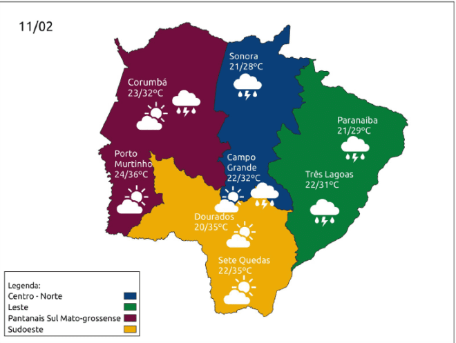 O clima típico do verão estará presente neste final de semana em grande parte de Mato Grosso do Sul. De acordo com o Centro de Monitoramento do Tempo e do Clima, a atuação de uma zona de convergência do Atlântico Sul (ZCAS), associada à disponibilidade de umidade e ao aquecimento diurno, pode provocar pancadas de chuvas e tempestades isoladas especialmente no extremo norte das regiões centro-norte, pantaneira e leste.