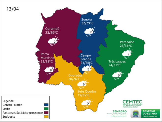 Confira no mapa elaborado pela equipe técnica do Cemtec/Semagro as condições de tempo e temperatura estimados para Capital e alguns municípios do Estado.
