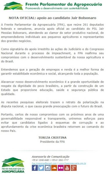 A Frente Parlamentar da Agropecuária (FPA) oficializou na manhã desta terça-feira, dia 2, apoio ao candidato à Presidência pelo PSL, Jair Bolsonaro. A presidente da entidade, deputada Tereza Cristina (DEM-MS), se encontrou com Bolsonaro no Rio de Janeiro para entregar um documento que formaliza o apoio da bancada ruralista, que conta com 234 deputados e 27 senadores, uma das maiores do Congresso Nacional, a ele no primeiro turno das eleições.