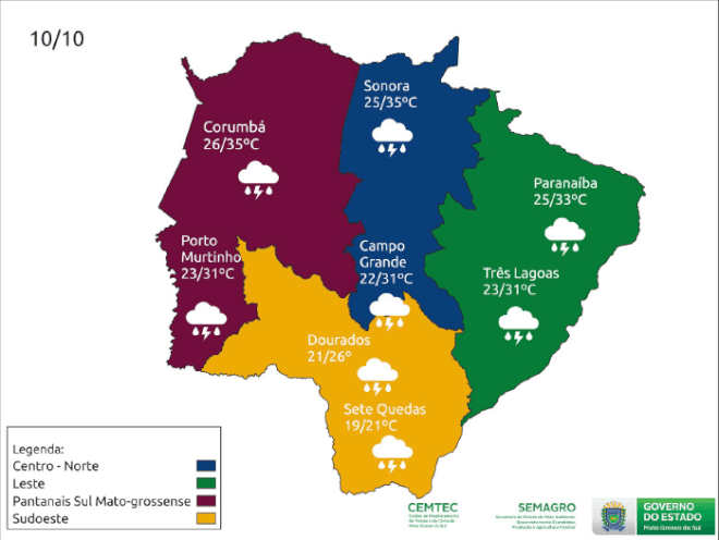 De acordo com o Centro de Monitoramento do Tempo e do Clima (Cemtec) há chance de tempestades acompanhadas de raios, rajadas de vento (30-60Km/h) e eventual queda de granizo nas regiões sudeste, central e leste, e porção sul da região pantaneira.