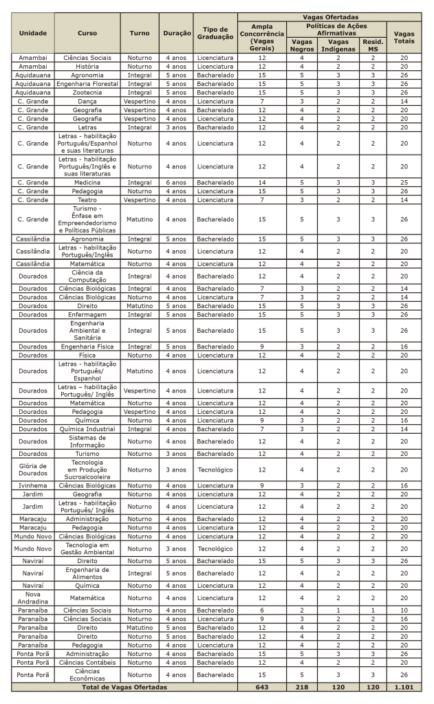É importante ressaltar que os candidatos poderão concorrer a cursos de qualquer uma das Unidades Universitárias da UEMS, abarcando um total de 54 diferentes cursos de Graduação (confira a Tabela dos Cursos AQUI).