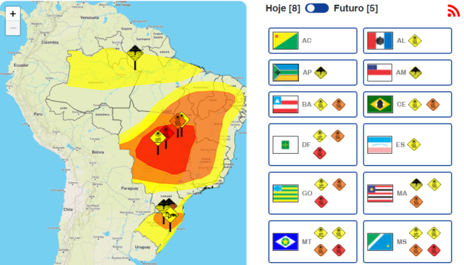 O Instituto Nacional de Meteorologia (Inmet) emitiu diversos alertas para Mato Grosso do Sul nesta segunda-feira (20). Um deles é para onda de calor e os outros três alertam para os riscos da baixa umidade que possui níveis diferentes para cada região.