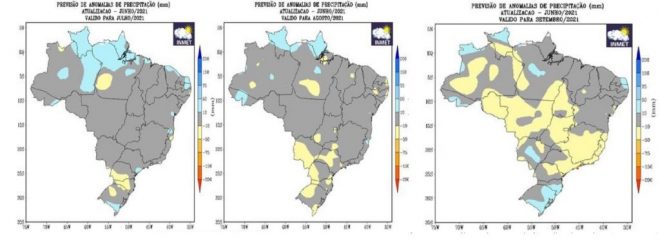No Centro-Oeste o inverno de 2021 será caracterizado pelo tempo seco, alta probabilidade de as chuvas ocorrerem dentro e abaixo da faixa climatológica em grande parte da região, exceto no centro sul do Mato Grosso do Sul, onde as chuvas deverão ser ligeiramente acima da média durante o mês de setembro.