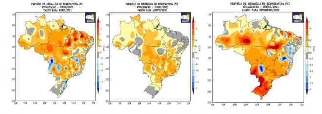 Massas de ar seco e quente deverão manter as temperaturas acima da média, principalmente nos meses de agosto e setembro, favorecendo focos de queimadas e incêndios florestais. Na parte leste de Mato Grosso do Sul as temperaturas podem ficar ligeiramente abaixo da média climatológica devido à passagem de algumas massas de ar frio mais continentais.