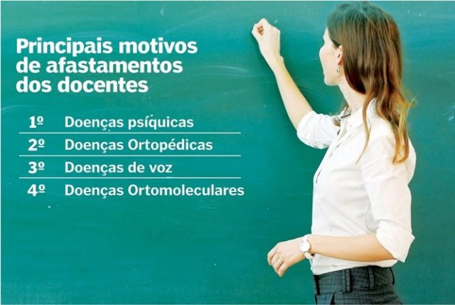 Segundo a pesquisa realizada por Lidiane de Paiva Mariano Baião e Rodrigo Gontijo Cunha, publicada com o título “Doenças e/ou Disfunções Ocupacionais no Meio Docente: Uma Revisão de Literatura”, os profissionais do magistérios convivem com a “… baixa remuneração, superlotação em sala de aula e inadequação estrutural das instituições…”, muitos ainda fazem dupla jornada, e a consequência é que dentre as principais doenças sofridas pelos professores encontram-se: stress, exaustão mental, síndrome de burnout, distúrbios da voz, disfunções musculoesqueléticas, depressão, HAS (hipertensão arterial sistêmica). Esses pesquisadores apresentam o seguinte gráfico: