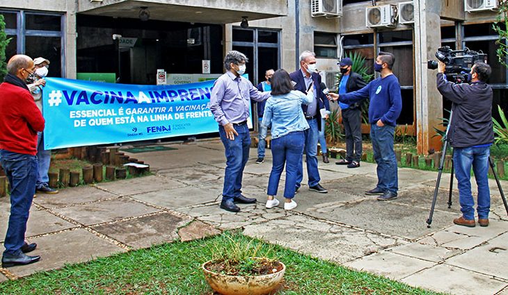 Em campanha nacional pela vacinação dos profissionais de imprensa, o Sindjor MS (Sindicato dos jornalistas) foi recebido pelo Secretário de Estado de Saúde, Geraldo Resende. Portando uma faixa com palavras de apelo pela imunização, alguns jornalistas chegaram cedo à porta da Secretaria, liderados pelo presidente, Walter Gonçalves Filho.