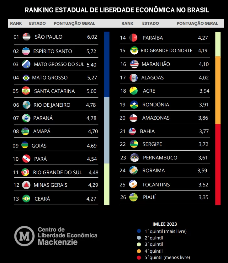 Vladmir Maciel explicou ainda que o estudo abrange todos os poderes e as três esferas (federal, estadual e municipal). Na avaliação do especialista, o Brasil e os estados ainda têm muito espaço para melhorar na liberdade econômica. A pontuação média do País no Índice Mackenzie de Liberdade Econômica Estadual subiu de 4,06 em 2022 para 4,38 no último ano.