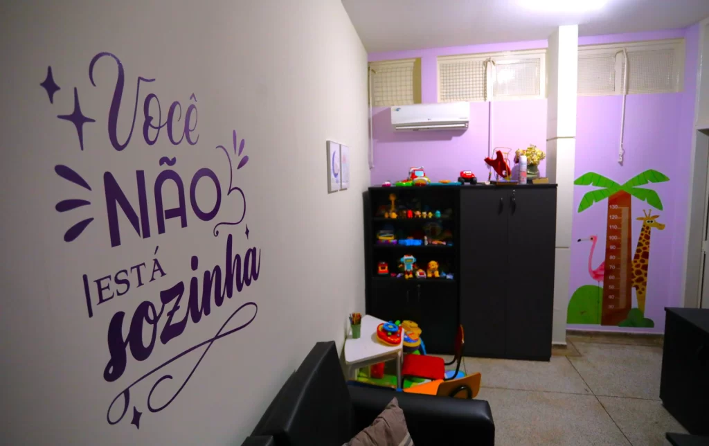 A sala é composta por dois ambientes, sendo um cartório para o escrivão que vai formalizar a denúncia e o outro (ambiente) tem brinquedos, sofá, banheiro com trocador, pois muitas vezes as vítimas estão com crianças e até bebês. O objetivo é oferecer toda tranquilidade e lugar seguro para seu filho, enquanto ela presta depoimento.