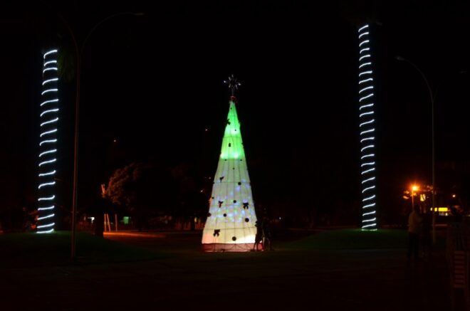 O prefeito Maurílio Ferreira Azambuja acompanhado da Primeira Dama Leila Gonçalves Azambuja, secretários e vereadores participaram do acender das luzes de natal.