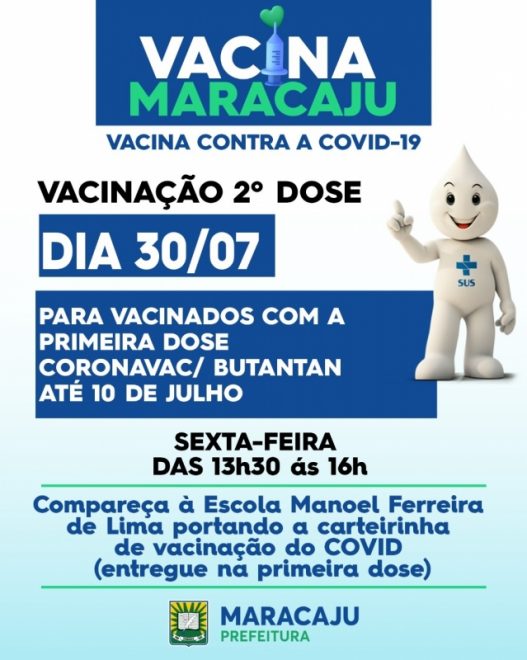 A Prefeitura de Maracaju volta a imunizar com a segunda dose da vacina CoronaVac/ Butantan nesta sexta-feira (30).