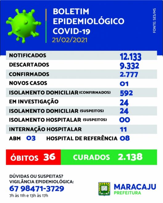Maracaju registra 01 novo caso de Covid-19 neste domingo (21/02)