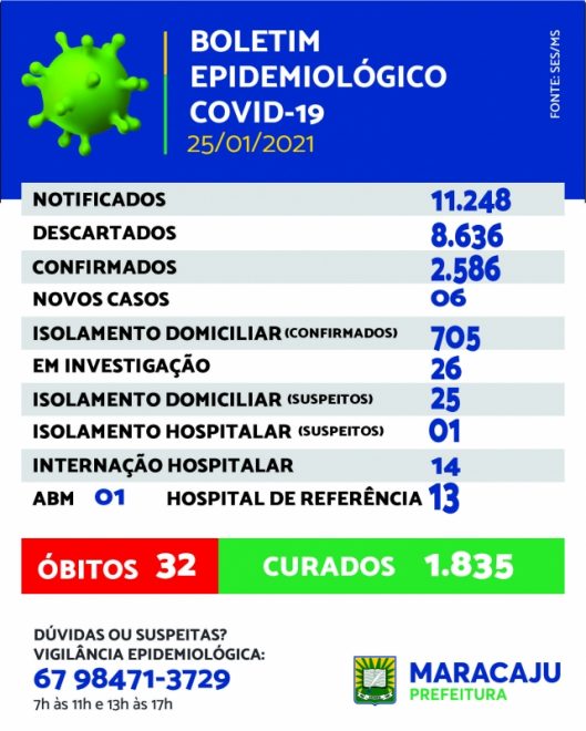 o fim da tarde desta segunda-feira (25-01-2021) a Secretaria Municipal de Saúde, através da Vigilância Epidemiológica divulgou o Boletim Epidemiológico do COVID-19 em Maracaju.