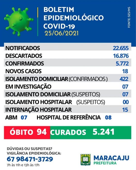 No fim da tarde deste sexta-feira (25-06-2021) a Secretaria Municipal de Saúde, através da Vigilância Epidemiológica divulgou o Boletim Epidemiológico do COVID-19 em Maracaju.
