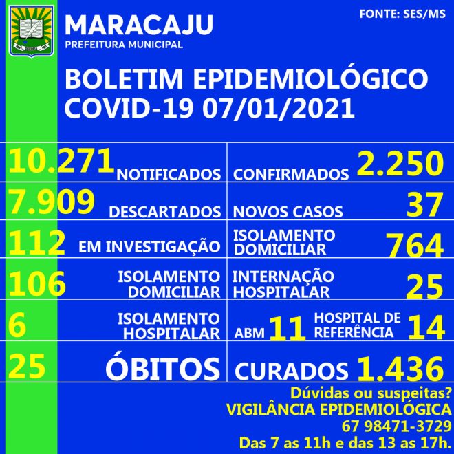 No início da noite desta quinta-feira (07-01-2021) a Secretaria Municipal de Saúde, através da Vigilância Epidemiológica divulgou o Boletim Epidemiológico do COVID-19 em Maracaju.