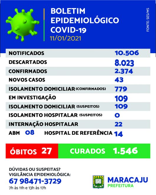 No fim da tarde desta segunda-feira (11-01-2021) a Secretaria Municipal de Saúde, através da Vigilância Epidemiológica divulgou o Boletim Epidemiológico do COVID-19 em Maracaju.