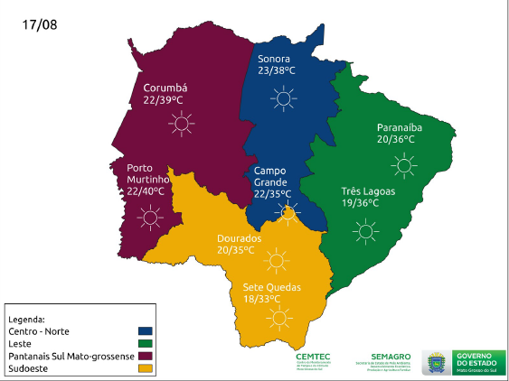 A tendência é de grande amplitude térmica, pois o Estado pode ter mínimas em torno de 15°C e as máximas podem chegar aos 40°C na região sudoeste e pantaneira.