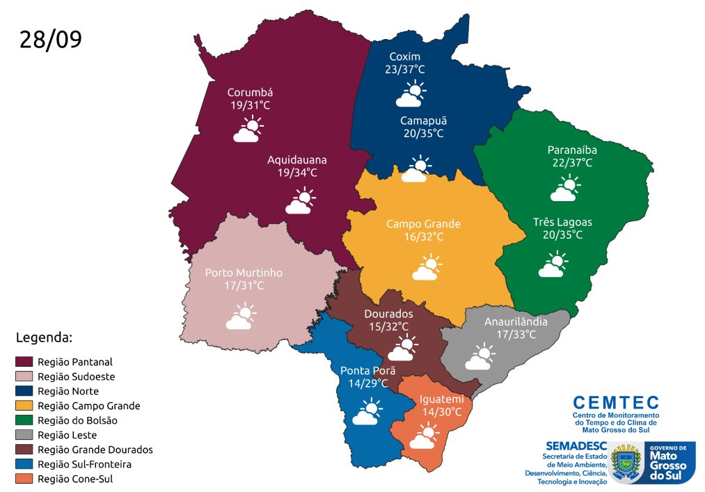 O Cemtec (Centro de Monitoramento do Tempo e do Clima) indica uma quinta-feira (28) de céu claro e temperaturas amenas para Mato Grosso do Sul. No entanto, ainda existe a possibilidade de chuvas e tempestades, que podem ser acompanhadas por raios e fortes rajadas de vento.