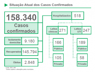Mato Grosso do Sul possui 12.270 casos ativos da doença, sendo 11.752 em isolamento domiciliar, e 518 pacientes internados.