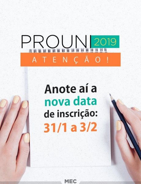 As inscrições para o processo seletivo do Prouni, referente ao 1º semestre de 2019, estarão abertas no período de 31 de janeiro de 2019 até as 23 horas e 59 minutos de 3 de fevereiro de 2019, observado o horário oficial de Brasília – DF.