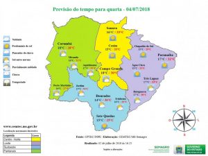 Campo Grande (MS) – Ar seco predomina sobre Mato Grosso do Sul deixando o tempo firme e sem expectativa de chuva. Com os termômetros marcando mínima de 14ºC e máxima de 32ºC e umidade relativa do ar registra baixa nas horas mais quentes do dia com variação de 85% a 25% .