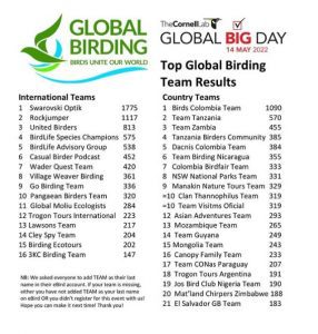 Com 336 espécies de aves registradas em 24 horas de evento, o que corresponde a 49,5% das 678 espécies catalogadas em nível estadual, Mato Grosso do Sul está no Top 10 mundial no Global Big Day, maior evento de observação de pássaros do mundo, com o time “Visit MS Oficial”. O resultado foi divulgado neste fim de semana e MS ficou em 5º lugar em nível nacional