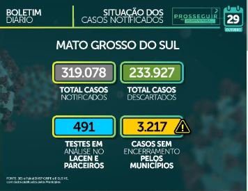 A SES também destacou que MS já contabiliza um total de 319.078 casos notificados, dos quais 233.927 foram descartados. Há 491 testes em análise no Lacen (Laboratório Central de Saúde Pública) e 3.217 casos sem encerramento pelos municípios.
