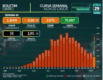 Com bases nos números, a média móvel no Estado foi calculada em 390,4 casos por dia, nos últimos 7 dias. O boletim traz que nas últimas 24 horas foram registrados 11 óbitos, elevando o total de vítimas fatais em MS para 1.518 e a média móvel em 8,1 óbitos por dia, nos últimos 7 dias, além de taxa de letalidade de 1,9%.