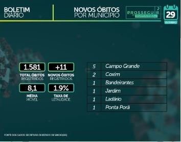 Os novos óbitos foram registrados em Campo Grande (5 mortes), Coxim (2), Bandeirantes (1), Jardim (1), Ladário (1) e Ponta Porã (1).
