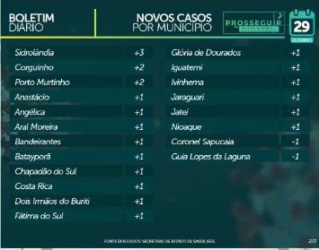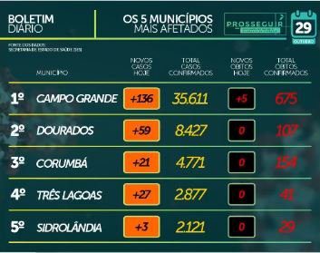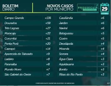 Os novos casos de hoje trazem Campo Grande à frente, com 136 novos casos, seguida por Dourados (59), Três Lagoas (27), Maracaju (22), dentre outros. Confira a tabela na galeria abaixo para mais detalhes e demais localidades.