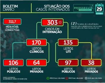 Dos 81.443 casos confirmados em MS, 75.987já estão recuperados. Em relação às internações, MS tem 303 pacientes internados, além de dois pacientes de outros estados que não são contabilizados como confirmados de MS. Destes 170 estão em leitos clínicos (106 públicos e 64 privados) e 135 em leitos de UTI (Unidade de Terapia Intensiva), dos quais 97 estão em leitos públicos e 38 em privados.