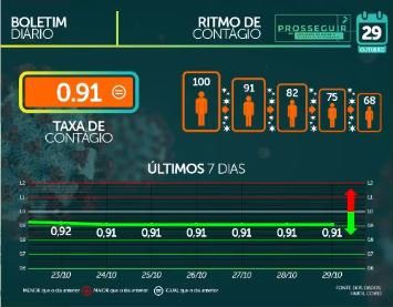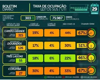 A taxa de ocupação de leitos de UTI públicos global nas 4 macrorregiões de MS é de: 67% em Campo Grande, 51% em Dourados, 46% em Três Lagoas e 67% em Corumbá. A taxa de contágio está calculada em 0,91 – a meta da SES é manter uma taxa menor que 1, que significa controle da doença.