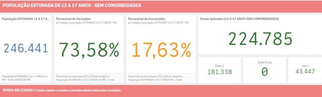 Com incentivo e apoio do governo do Estado, Mato Grosso do Sul já vacinou 73,5% dos jovens sem comorbidades de 12 a 17 anos. Isto representa 181.338 adolescentes imunizados com a primeira dose e 43.447 já com a segunda dose. O atendimento a esse grupo foi autorizado pela Secretaria Estadual de Saúde (SES) desde o dia 13 de agosto.