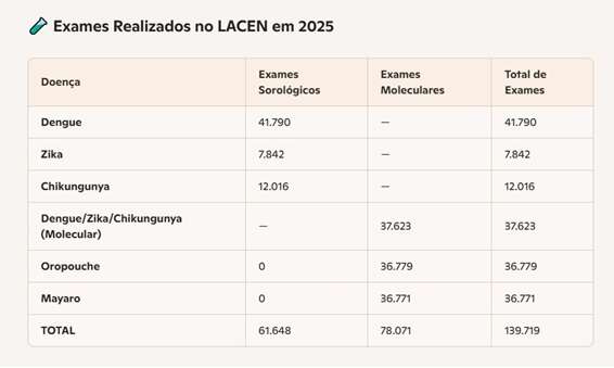 Mais de 139 mil exames foram realizados em 2025, com destaque para dengue, zika, chikungunya, oropouche e mayaro