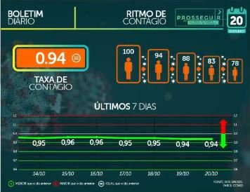 A taxa de ocupação de leitos de UTI públicos global nas 4 macrorregiões de MS é de: 69% em Campo Grande, 59% em Dourados, 36% em Três Lagoas e 59% em Corumbá. A taxa de contágio está calculada em 0,94 – a meta da SES é manter uma taxa menor que 1, que significa controle da doença.