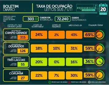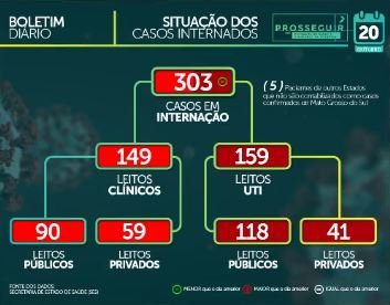 Dos 77.943 casos confirmados em MS, 72.240 já estão recuperados. Em relação às internações, MS tem 303 pacientes internados, além de 5 pacientes de outros estados que não são contabilizados como confirmados de MS. Destes 149 estão em leitos clínicos (90 públicos e 59 privados) e 159 em leitos de UTI (Unidade de Terapia Intensiva), dos quais 118 estão em leitos públicos e 41 em privados.