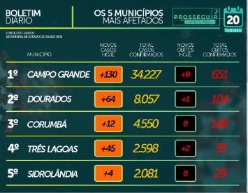 Os novos casos de hoje trazem Campo Grande à frente, com 130 novos casos, seguida por Dourados (64), Três Lagoas (45), Aquidauana (19), dentre outros. Confira a tabela na galeria abaixo para mais detalhes e demais localidades.
