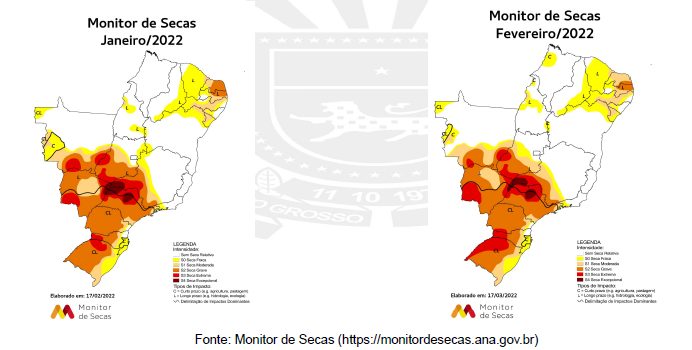 Monitoramento mensal das secas elaborado pelo Centro de Monitoramento do Tempo e do Clima (Cemtec) aponta que no mês de fevereiro as chuvas em Mato Grosso do Sul registraram valores até 75% abaixo da média histórica em grande parte dos 79 municípios, e os acumulados de chuva variaram entre 0 – 120 mm. O relatório emitido pelo Cemtec/Semagro explica que a situação está relacionada à atuação de massas de ar seco e quente, que são sistemas de alta pressão atmosférica.