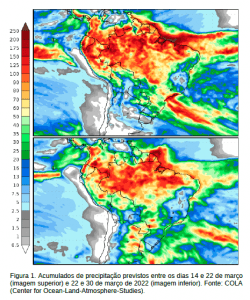 Maiores volumes de chuva estão previstos para o período entre 22 a 30 de março, quando existe a probabilidade de chuvas de intensidade moderada a localmente forte e tempestades acompanhadas de raios e rajadas de vento. Neste período os acumulados podem variar entre 5-125 mm, especialmente nas regiões sudoeste e leste do Estado.